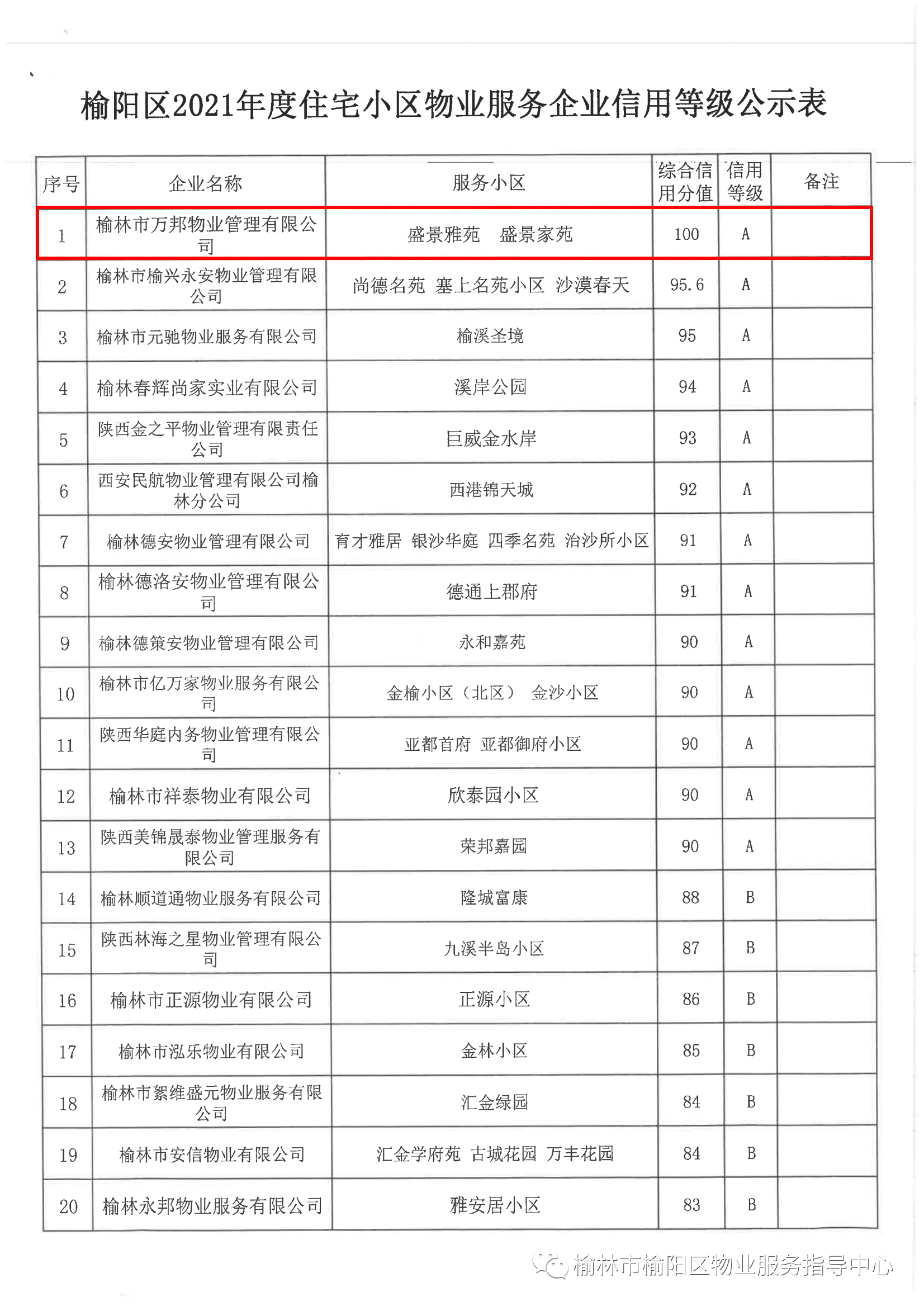 近日,榆陽(yáng)區(qū)發(fā)布2021年度住宅小區(qū)物業(yè)服務(wù)企業(yè)信用等級(jí)公示,榆林市萬(wàn)邦物業(yè)管理有限公司憑借歷年來(lái)在物業(yè)行業(yè)的精耕細(xì)作和誠(chéng)信經(jīng)營(yíng),順利通過信用等級(jí)評(píng)定,以綜合信用分值100分、信用等級(jí)A級(jí)位居榜首。
